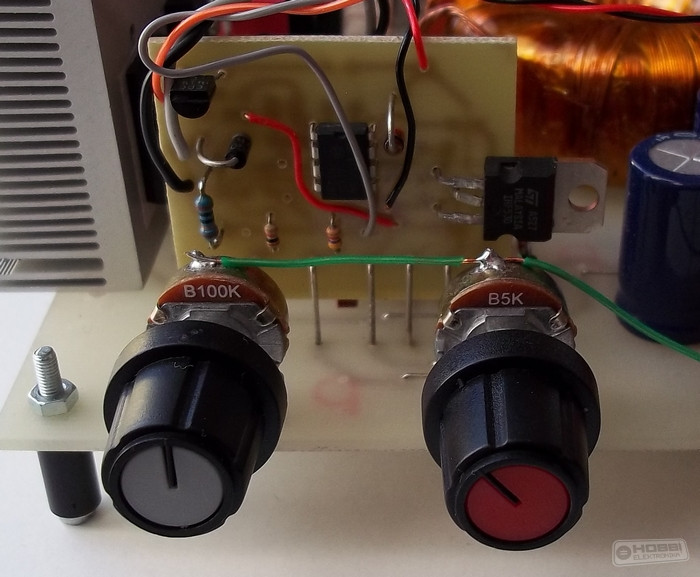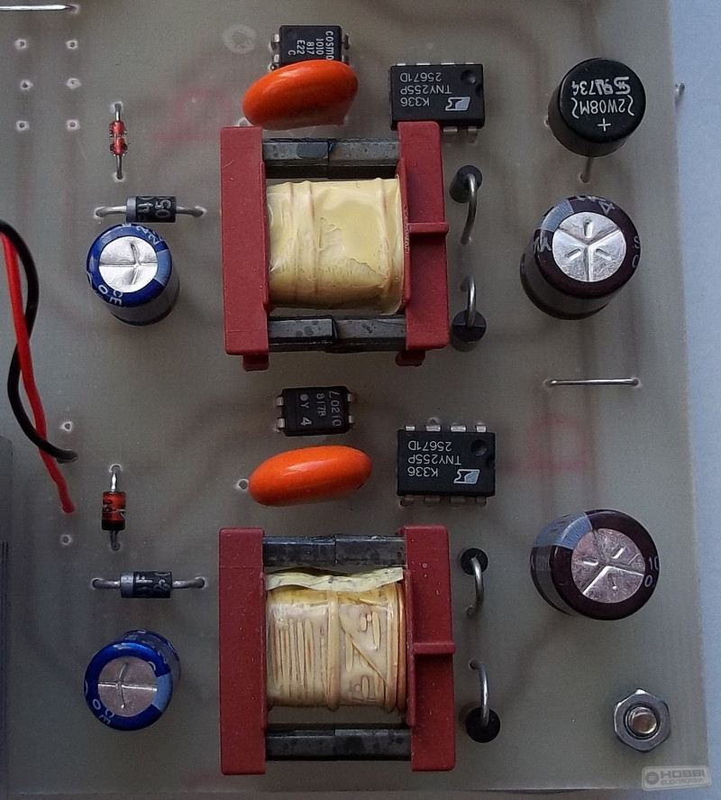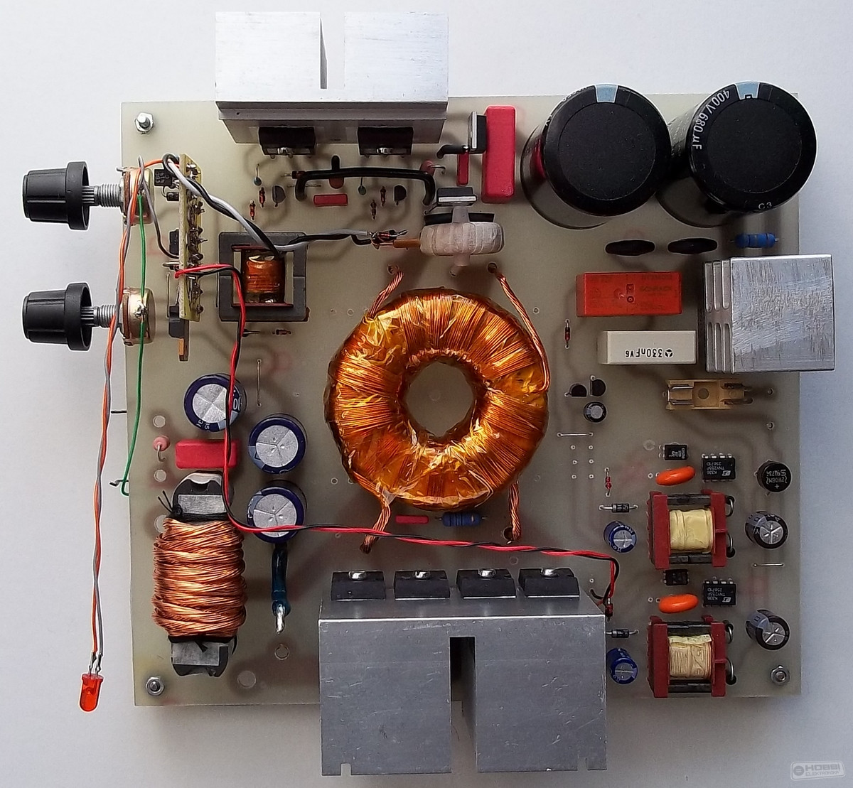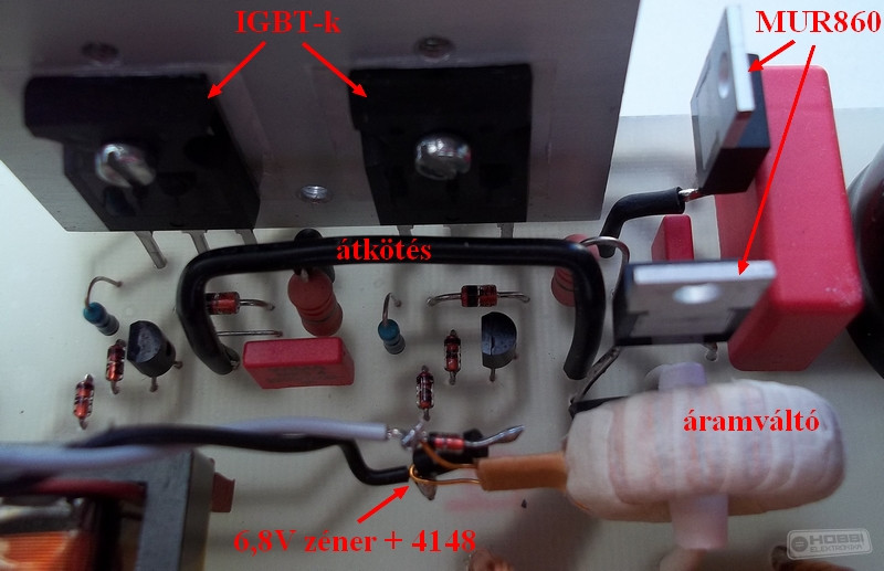 Az áramkör élesztését a primer feszültség nélkül kezdjük. Külső labortápról adunk 14 V feszültséget a vezérlőpanelnek, ekkor az IGBT-k gate-jein meg kell jelenni a 48 kHz-es négyszögjelnek, és az ábra szerint kell kinézniük. A két IGBT-n ugyanolyan fázisú jelnek kell lenni. Ha van kétcsatornás szkópunk, akkor azzal meg tudjuk ezt nézni. A labortápból a vezérlő áramkörnek 90-110 mA körüli áramot kell felvenni. Amennyiben van 120-150 V körüli áramkorlátos DC tápegységünk, akkor arra ráköthetjük a tápegységet, ekkora feszültségről már működnie kell, leellenőrizhető, hogy működik-e egyáltalán a feszültségszabályozás. Ha nincs, akkor közvetlenül, vagy leválasztó trafón keresztül a hálózatra kell kötni. Ilyenkor a negatív kimenetet egy Y kondenzátorral kössük le a hálózat védőföldjére. Az áramváltó trafó lezáró ellenállása az élesztés során kezdetben 47-100 Ω körüli legyen, és győződjünk meg róla hogy működik-e rendesen a feszültség és az áramszabályozás, tehát állítható-e a feszültség 3 és kb. 54 V között, illetve egy kisebb terheléssel nézzük meg, hogy tudjuk-e állítani az áramot a terhelésen, ami ilyenkor maximum néhány A lehet, illetve az árampotival le kell tudnunk tekerni a kimenetet nullára. Ha minden rendben működik, akkor kicserélhetjük az áramváltó lezáró ellenállását a kívánt értékűre, és használatba vehetjük a tápegységet, vagy a hegesztőt. A tápegység feszültségmérővel könnyen kiegészíthető, aminek tápfeszültség akár a ventilátorok 11 V-jából is nyerhető. Az áram mérésére pedig vagy beiktatunk a kimenetre egy 0,01 Ω-os, nagy áramú söntöt, vagy az áramszabályozáshoz hasonló áramváltós megoldással a szekunder kör áramát mérjük, és az áramjelet átalakítva feszültséggé, azt egy műszerrel kijelezzük. A tápegység határait a tesztek során nem feszegettem, ez az után építőkre vár. A hegesztőáram értékével lehetőleg ne menjünk 90 A fölé. Ez általában a ház körüli munkákhoz elég, és mivel 120 A-nyi diódánk van a szekunder oldalon, így azokban sem teszünk kárt zárlat esetén sem. A tesztek során 80 A körüli árammal hegesztettem, ami a potival kb. 25-30 A-ig tekerhető le, ennél kisebb értéknél a vezérlés leáll. Az áramkör NYÁK-terve letölthető lay formátumban a képre kattintva: Készítettem még néhány, nagyobb méretű képet a teljes áramkörről és néhány áramköri részletről: A tápegység elkészítéséhez mindenkinek meleg pákát kívánok! |