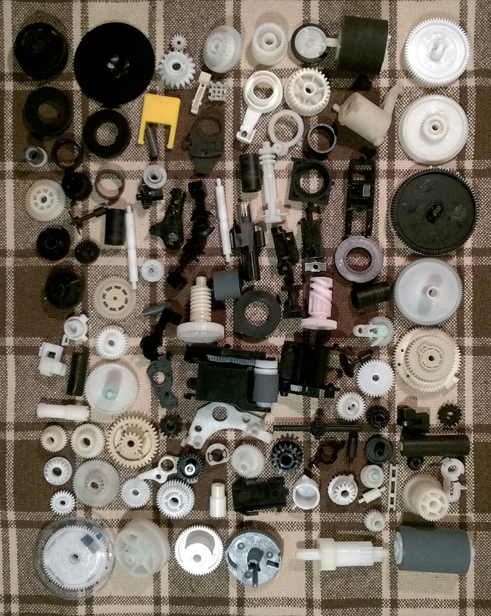 Vannak benne DC motorok (nyomtatóból, floppy meghajtóból bontva), fogaskerekek, bordásszíjak, egyebek.