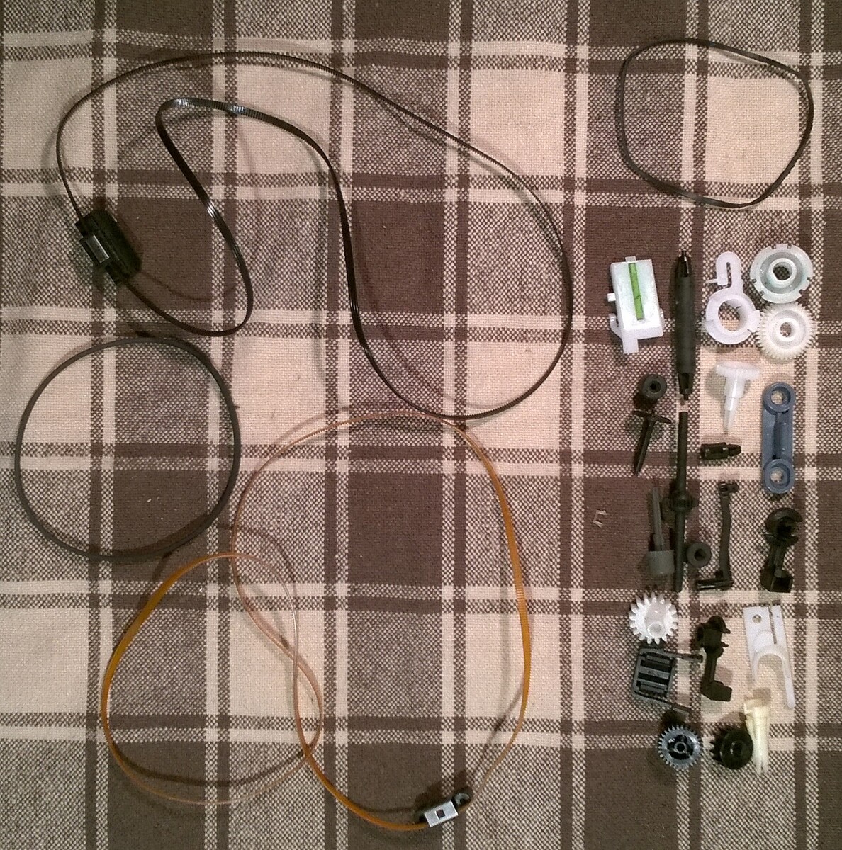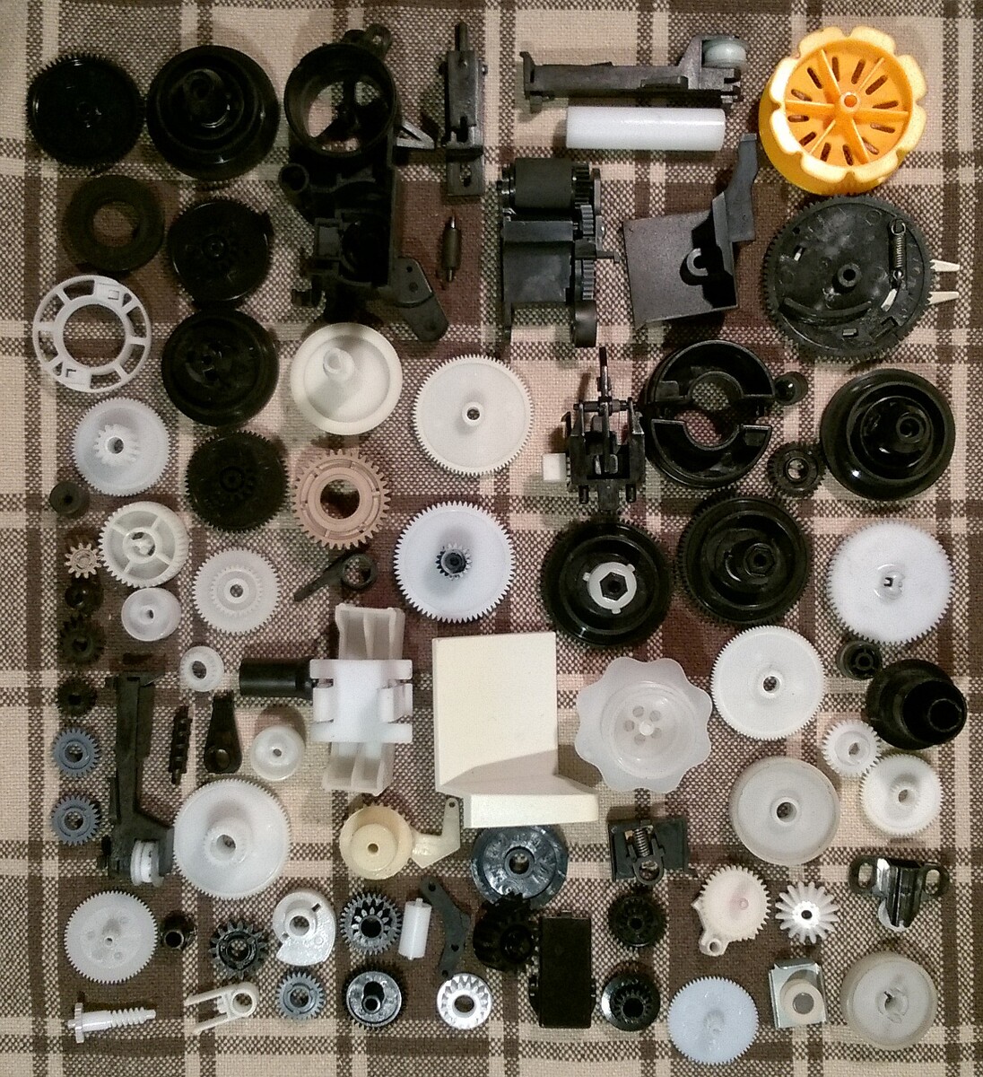 Vannak benne DC motorok (nyomtatóból, floppy meghajtóból bontva), fogaskerekek, bordásszíjak, egyebek.