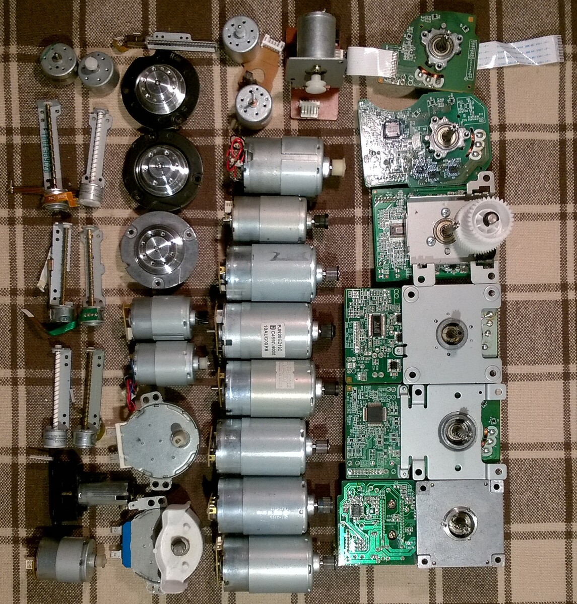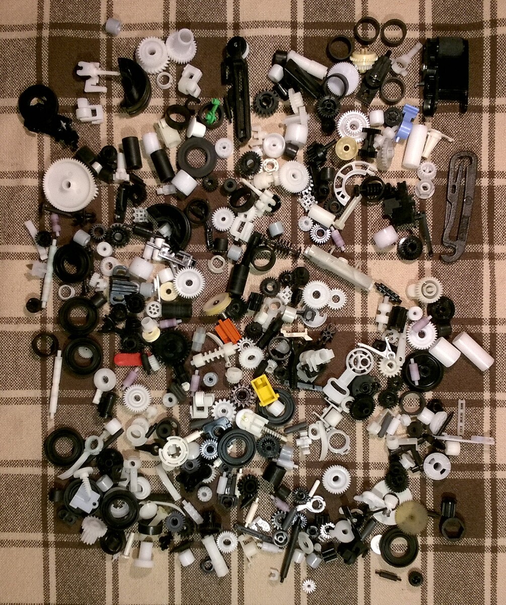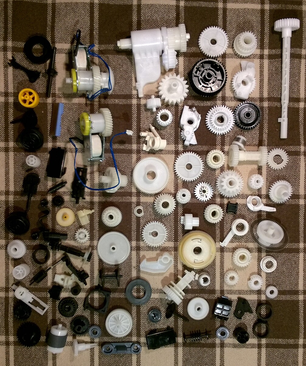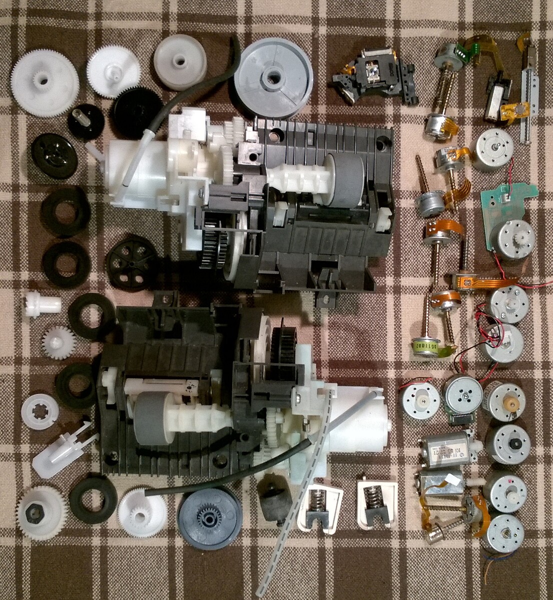 Vannak benne DC motorok (nyomtatóból, floppy meghajtóból bontva), fogaskerekek, bordásszíjak, tintaszívó egység, egyebek.