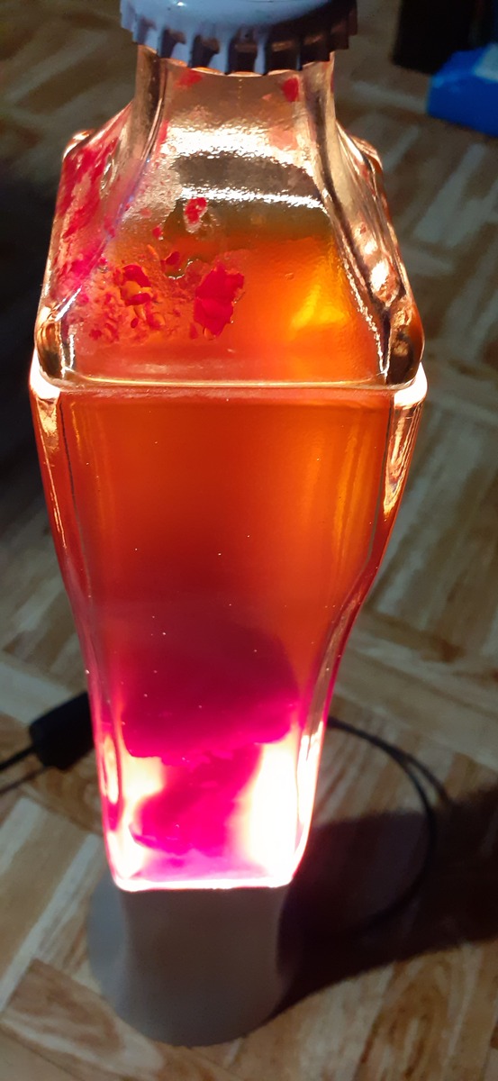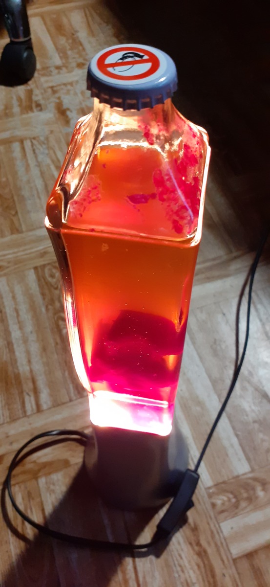 40 cm magas, piros színű, és változtatja le-fel az alakját és színárnyalatait. Ez típus nagyon ritka, szögletes üveg, fém kupak, és valóban üvegből van, nem műanyagból. 230 V~ 25 W E14. Nagyon szép hangulatfényt teremt, ki-be kapcsolható.
