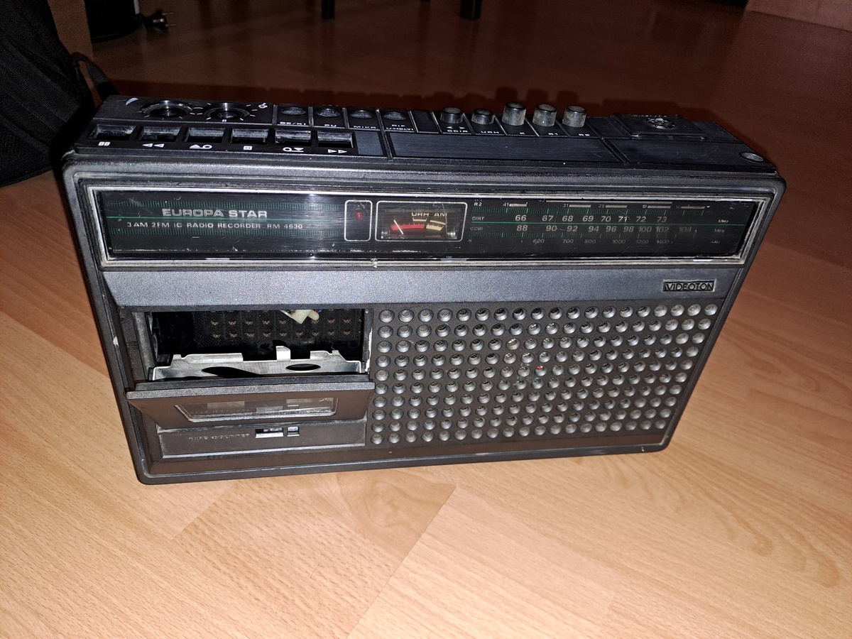Ami megvan, az látszólag ép és piszkálástól mentes, de a hangszóró mérve szakadt (membránja viszont ép). Elemtartó tiszta, külső burkolat ép, szóval akár külsőleg romos gépet egészben átrakni ebbe is egy lehetséges felhasználás lehetne.