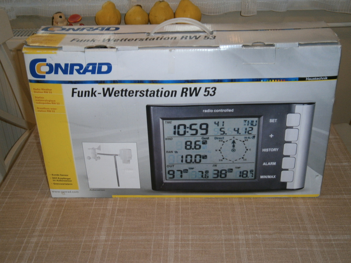 A Conrad RW 53 egy modern, nagy pontosságú vezeték nélküli időjárás-érzékelő kombinált érzékelővel . Méri mind a beltéri, mind a kültéri hőmérsékletet és páratartalmat . Akár 100 méteres távolságig is elérhető, és milliméterben adja meg a szélsebesség és a csapadék adatait. Az intelligens időjárás-állomás 200 időjárás-adat tárolására alkalmas memóriával rendelkezik . Egy második vevőállomás is rendelkezésre áll.