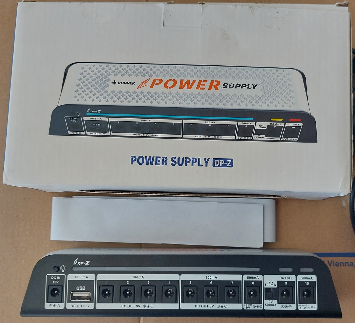 Eladó a tárgyban szereplő Donner DP-Z gitárpedál tápegység tartozékaival, dobozában.