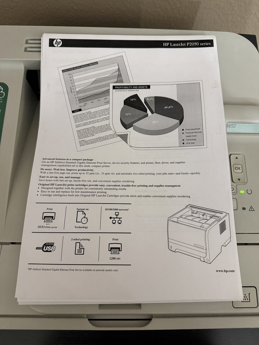 A nyomtató hibátlanul működik, nem gyűri a papírt. A tesztnyomtatáson látható egy-két apró folt, de az a toneren van, azt érdemes cserélni. Ha nem zavar, akkor még 2-3e oldalt ki lehet nyomtatni vele.
