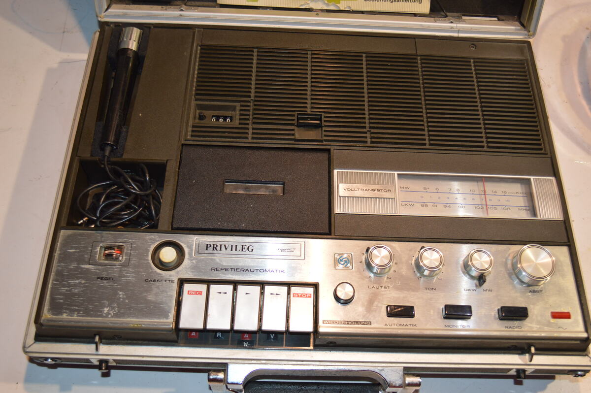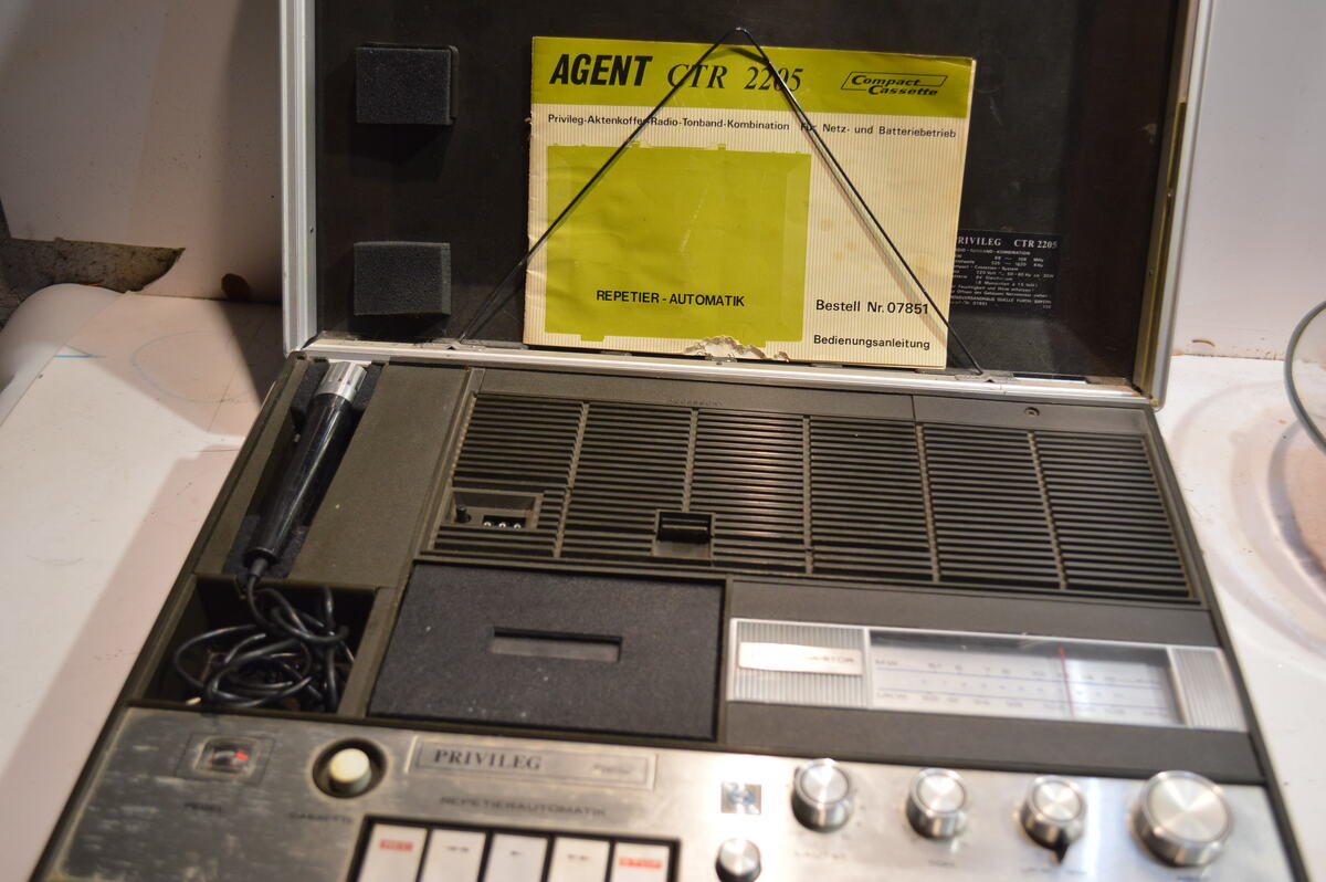 Aktatáskába építve, rádiós rész működik,kazettásba ékszíjat kell cserélni,üres kazettatartónál a felcsévélő orsó elindul lejátszáskor,hálózati kábellel, saját mikrofonnal Bp. XI.ker. ben átvehető