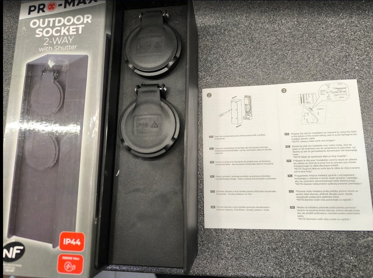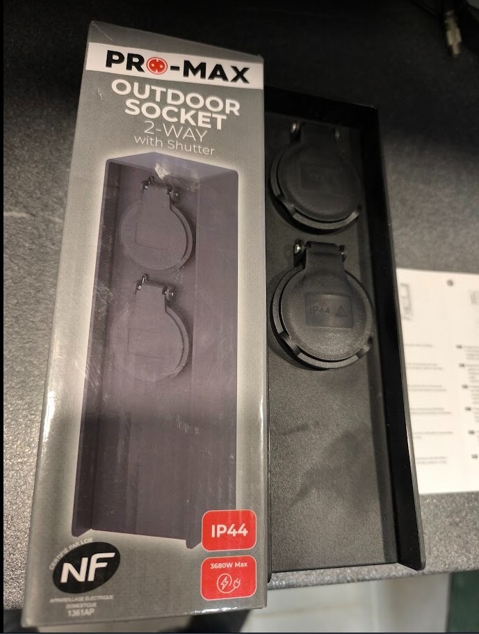 Eladó PRO-MAX Outdoor Socket 2-Way kültéri dugalj, vadonatúj, eredeti csomagolásban. Időjárásálló, IP44 védelemmel ellátott dupla kültéri konnektor, beépített védőfedéllel (shutter), amely megóvja az aljzatokat esőtől, fröccsenő víztől és szennyeződéstől. Ideális kertbe, teraszra, garázsba, műhelybe vagy kültéri elektromos eszközök csatlakoztatásához. Maximális terhelhetőség: 3680 W. NF minősítéssel rendelkezik