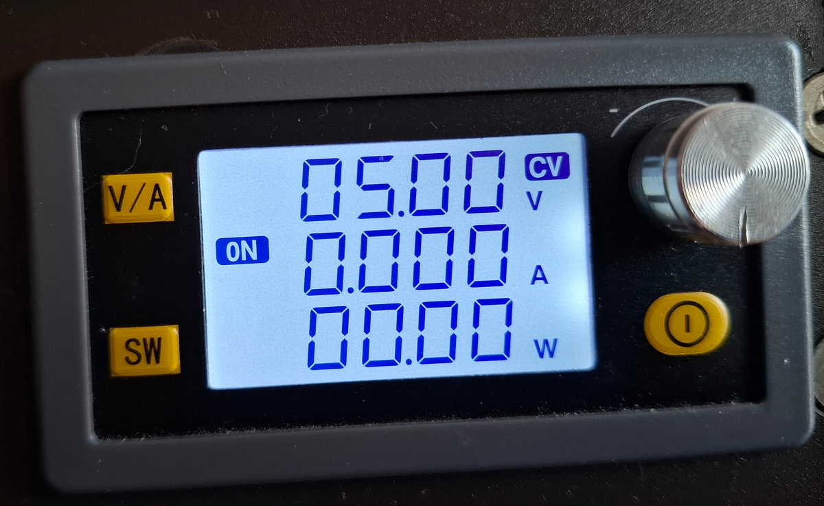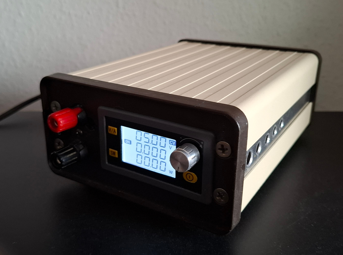 Maszív dobozban "Buck Boost Power Supply Modul" amit egy laptop táp lát el árammal, ház és modul is kapott ventilátort, ezek kikapcsolhatóak.