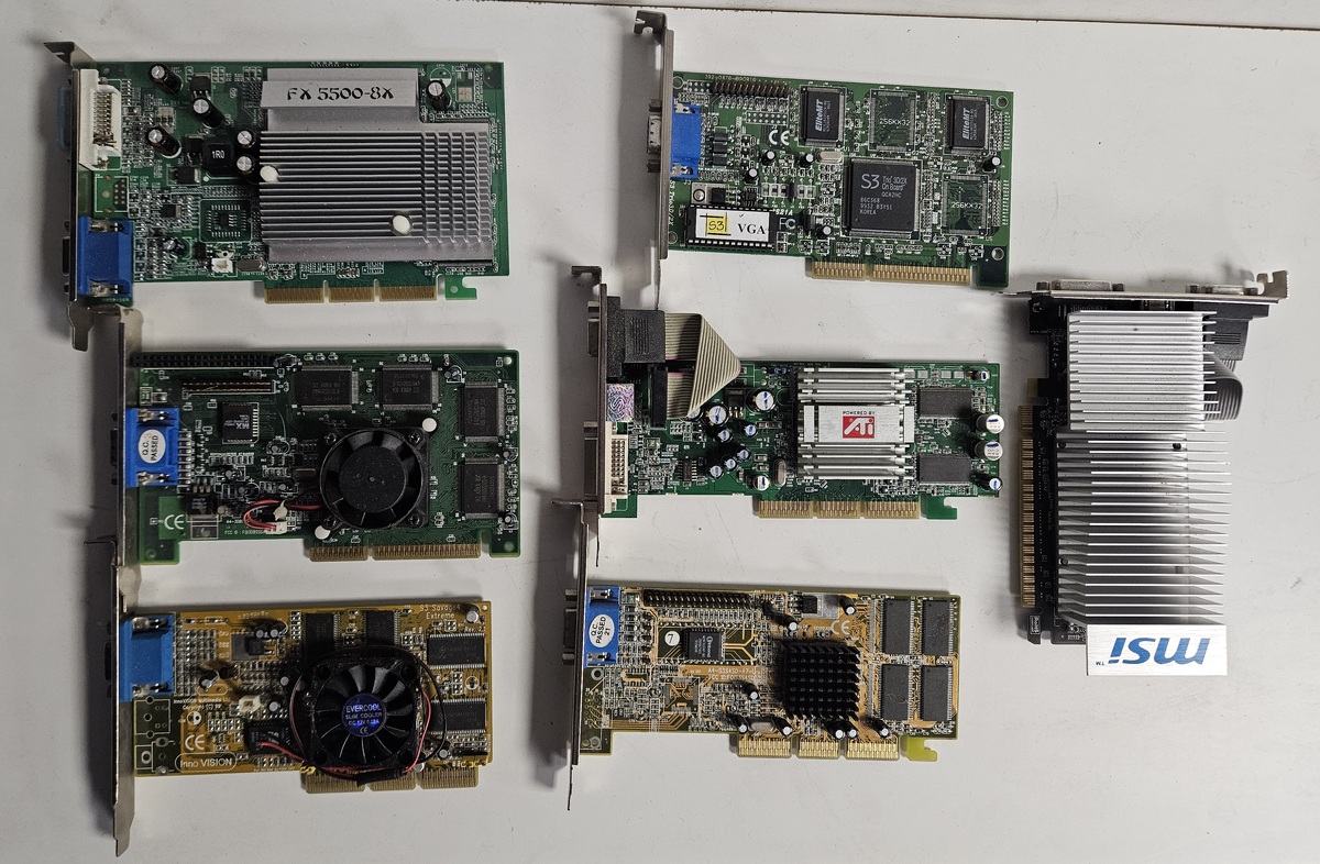 Eladók a képen látható AGP-s videókártyák egyben. Tesztelni nem tudom, így hibásként hirdetem. A jobb szélen lévő PCIe MSI kártya ajándék, ez biztosan hibás.