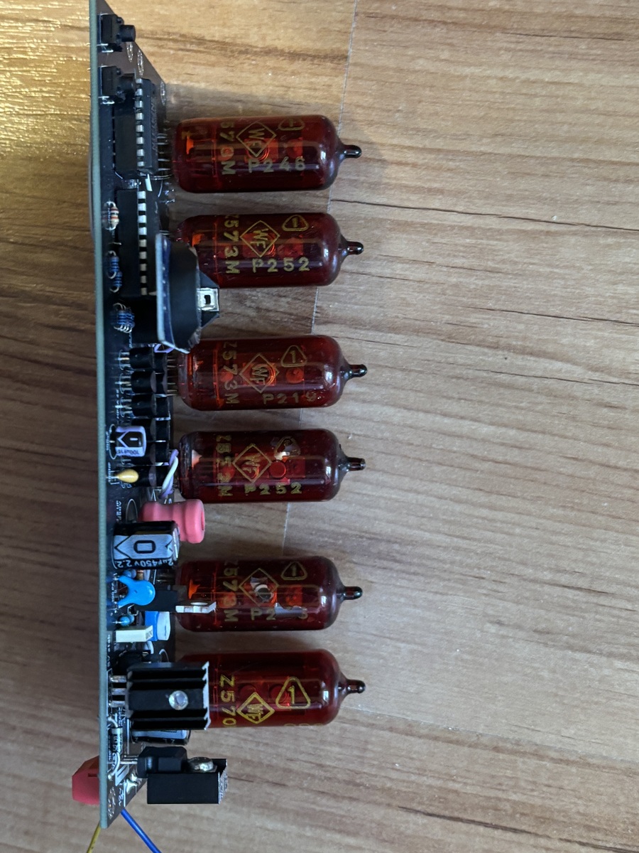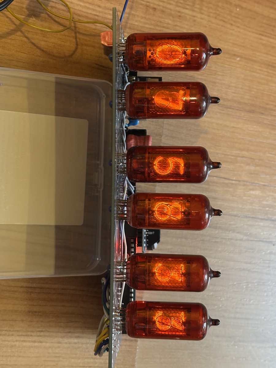Az alap kapcsolás itt a Hobbielektronikán közzétett Tom025 cikke alapján, sooty program kiegészítésével (DS3231) készült. Kapott még egy 555 IC-vel felépített kapcsoló üzemű nagyfesz tápot, ami a NIXIE csövek meghajtásáért szükséges feszültség előállítását hivatott megoldani. Az óra nagyon pontos, köszönhetően az RTC modulnak. A csövek Z573 valamin van egy Z570 ami alkalmazásra került. Az óra Új alkatrészekkel készült, beleértve a csöveket is.