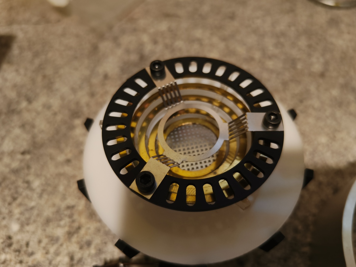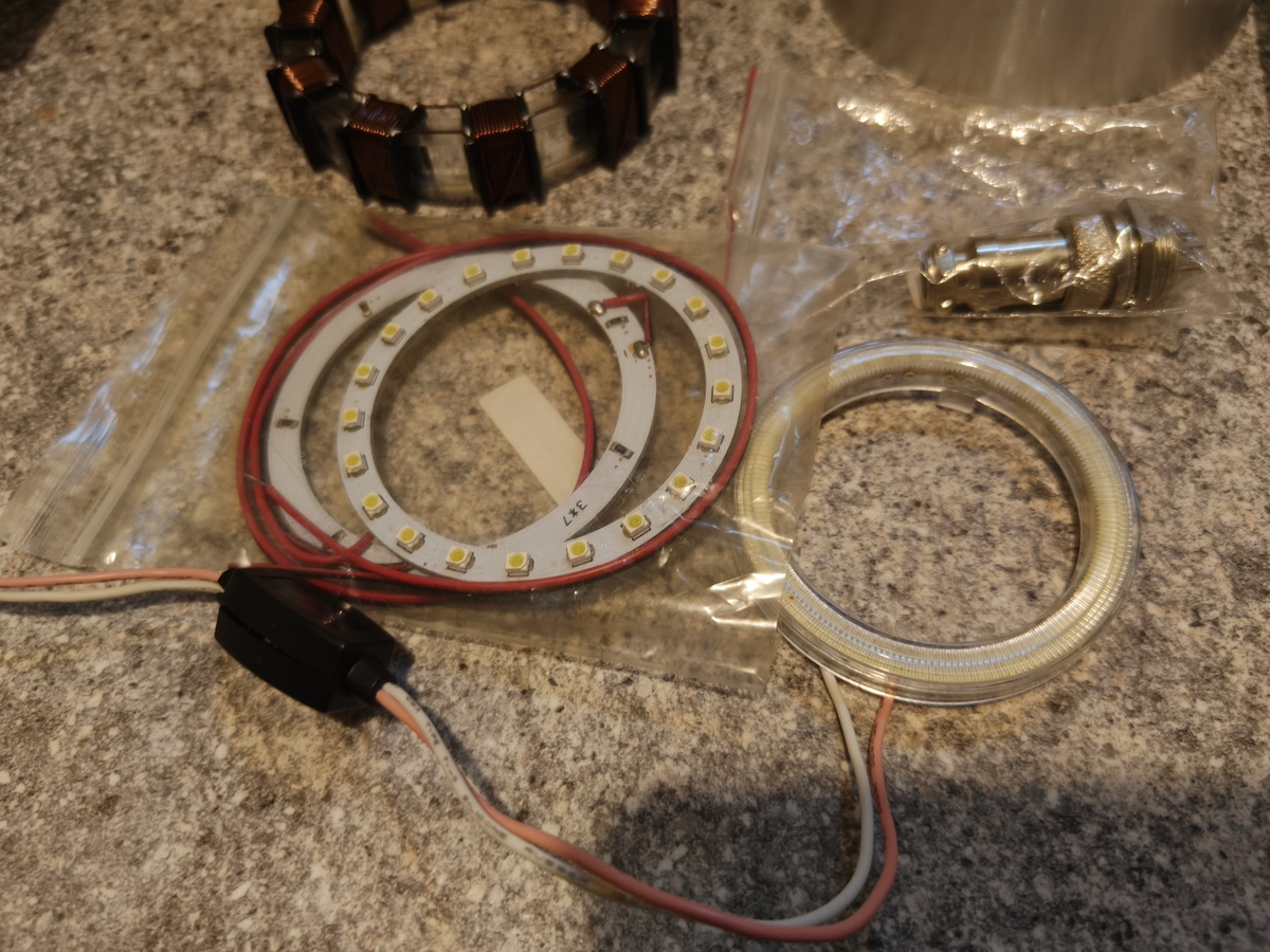 Mérete ellenére jó sok meló volt benni, a kis össze--vissza alkatrészek legyártásában. Cnc, lézer és eszterga, stb. A tekercselés, pl. cnc n készitett plexigyűrűn van. A gyűrű aluminiumból készült, lézerrel gravirozva a betűk.