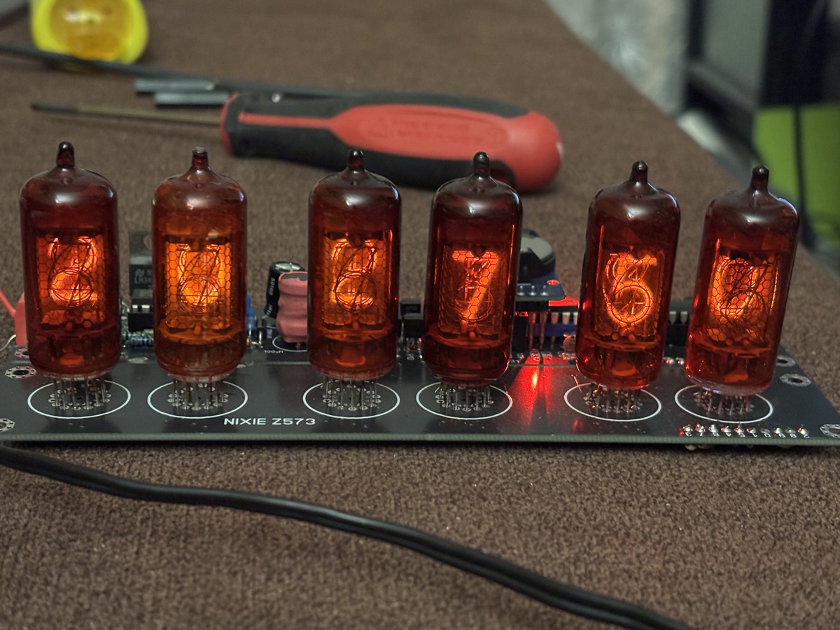 Az alap kapcsolás itt a Hobbielektronikán közzétett Tom025 cikke alapján, sooty program kiegészítésével (DS3231) készült. Kapott még egy 555 IC-vel felépített kapcsoló üzemű nagyfesz tápot, ami a NIXIE csövek meghajtásáért szükséges feszültség előállítását hivatott megoldani. Az óra nagyon pontos, köszönhetően az RTC modulnak. A csövek Z573M. Az óra Új alkatrészekkel készült, beleértve a csöveket is.