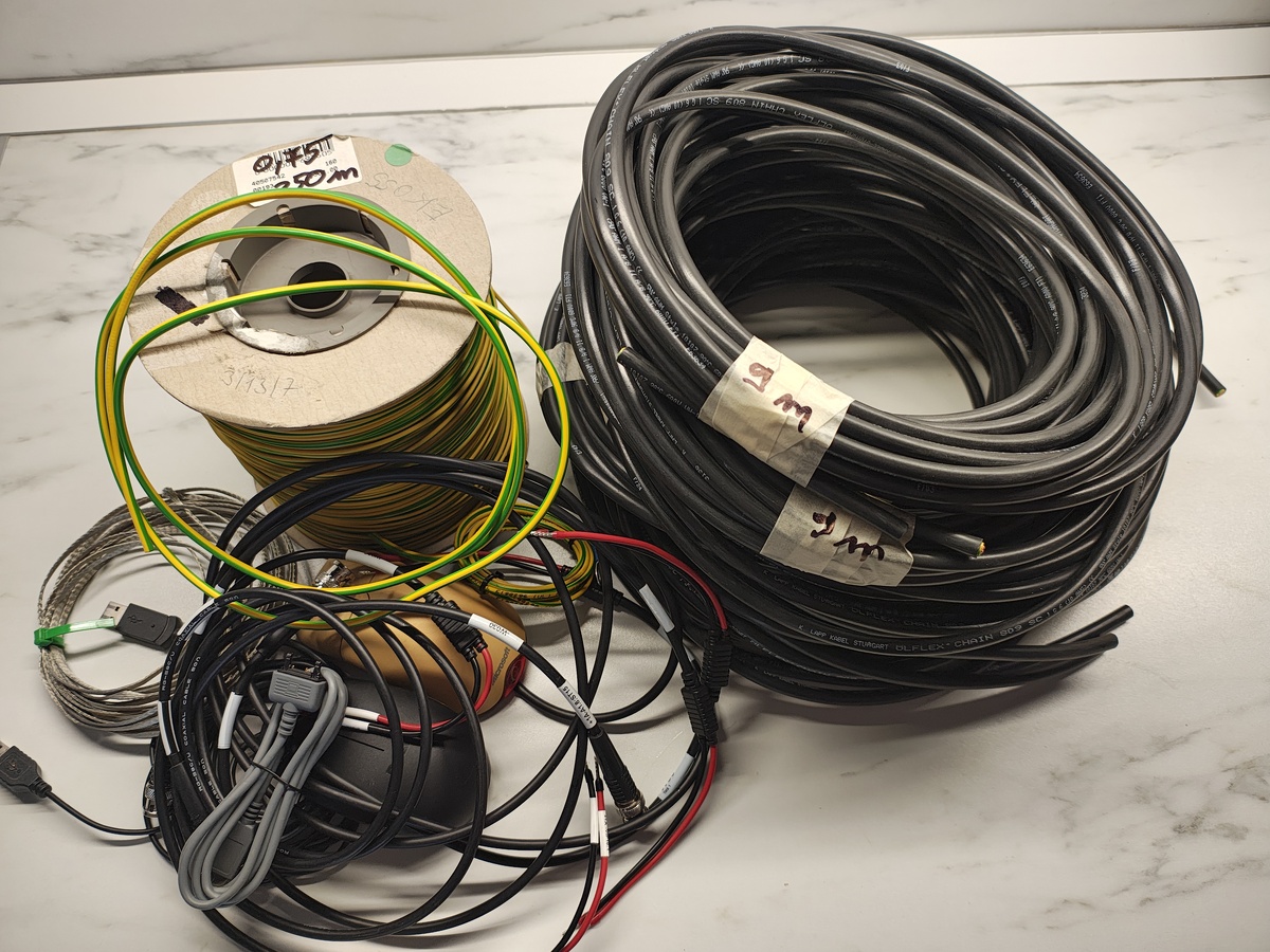 A hat négyzetes Ölflex, energialáncban használatos kábelek darabokban vannak a képen látható módon, kb 80m összesen. A nulla 75-ös guriga egyben 250m hosszban van. Minden egyéb ami a képen látszik (egér, régi töltőkábel stb) benne van a csomagban.