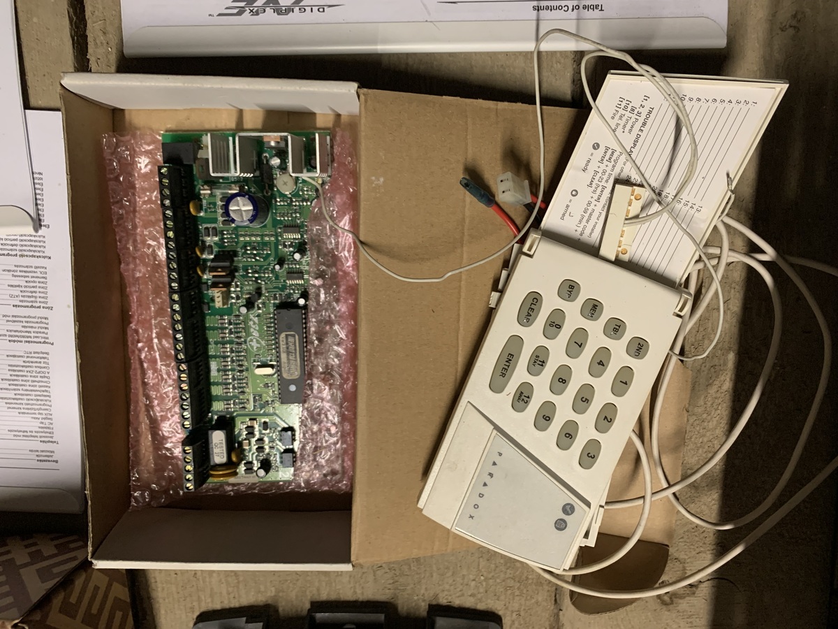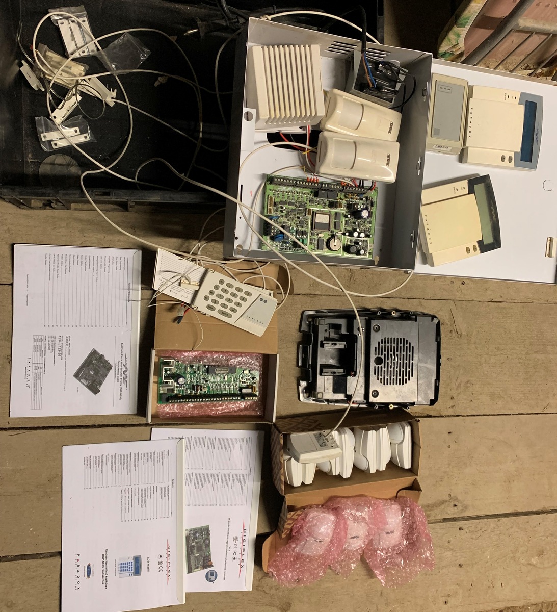 Tartalma: fém doboz, trafó, beltéri sziréna, riasztóközpont, 2 db paradox kezelőegység, 1db RFID olvasó, DSC PIR-ek, kültéri sziréna, aminek elveszett a külső burkolata. Plusz doksik.