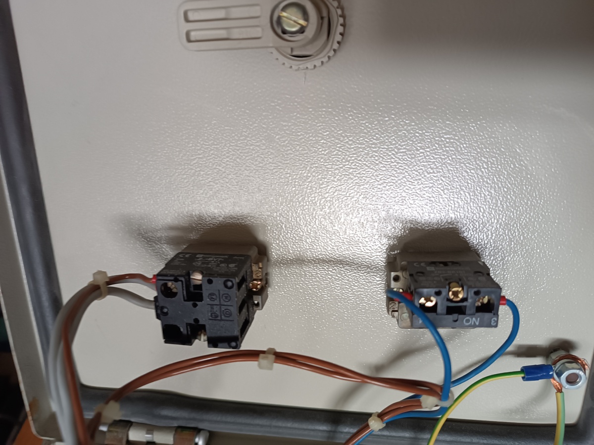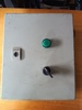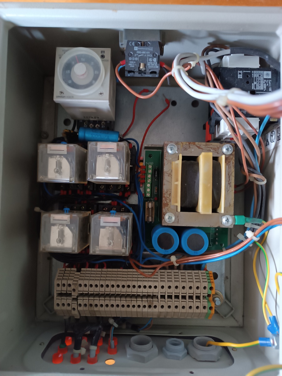 Eladó komplett kacsoló szekrény főkapcsolóval, visszajelzővel, relékkel, tápegységgel és időzítővel a fotókon látható kialakításban.