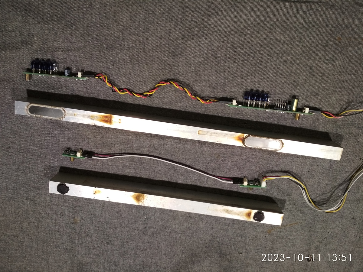 Bontott darabok. A szabadtéri időjárás kissé megviselte a tokozást, de hibátlanul működnek. Újrahasznosítási szándék esetén minden információt át tudok adni (pcb, sch, asm). A vevőpaneleken TSOP36156, az adókon TSAL6100 infraLED-ek, TS2950-5.0, PIC12F1822, valamint TSM4953 FET-ek vannak. Több készlet van még belőlük.