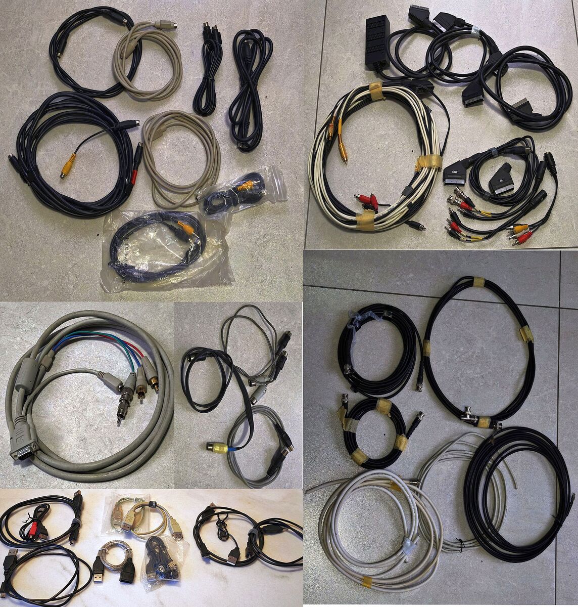 Eladók a képen látható kábelek: S-Video, Euro-Scart (különböző adpterekkel is), D-SUB szétválasztó, 5 pólusú tuchel dugók, koax, USB toldó és OTG. Egy részük sosem használt.