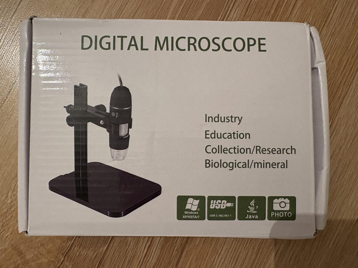 Használt, tökéletesen működő kis USB mikroszkóp dobozában.