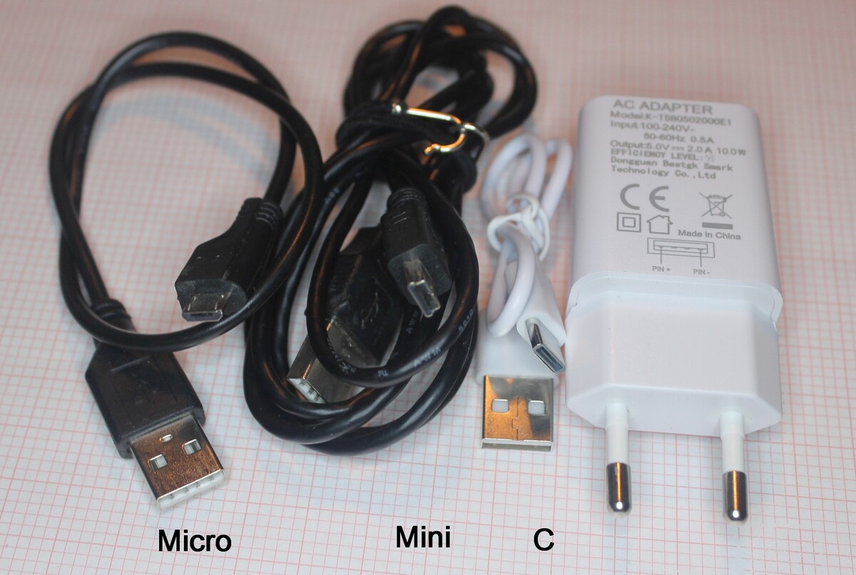 USB aljzatos hálózati töltő a képeken látható három féle USB kábellel.