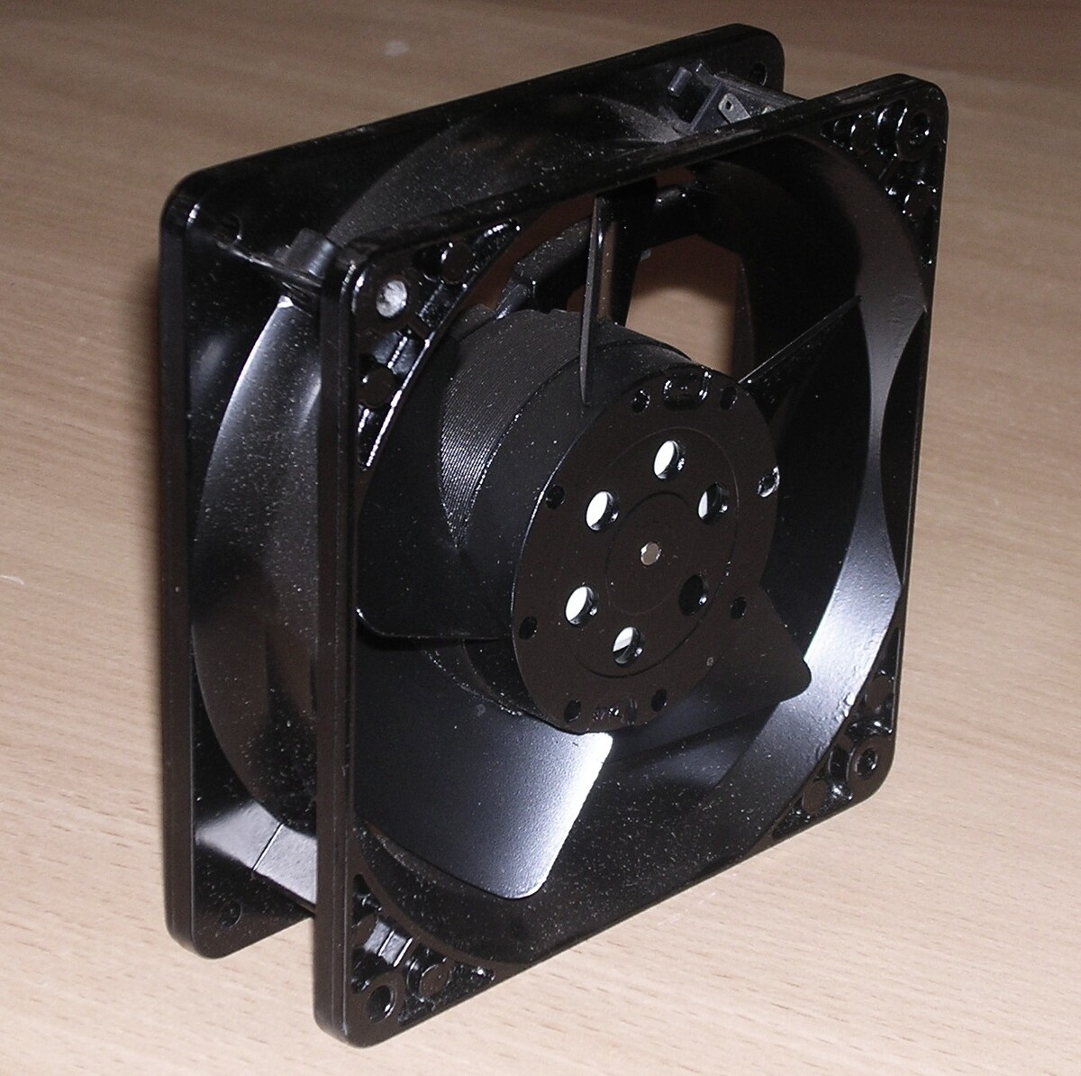 5 lapátos,120×120 mm méretű, teljesen fémből készült, 230 V 19 W-os Papst ventilátor, ahogy a képeken látható. Új.