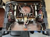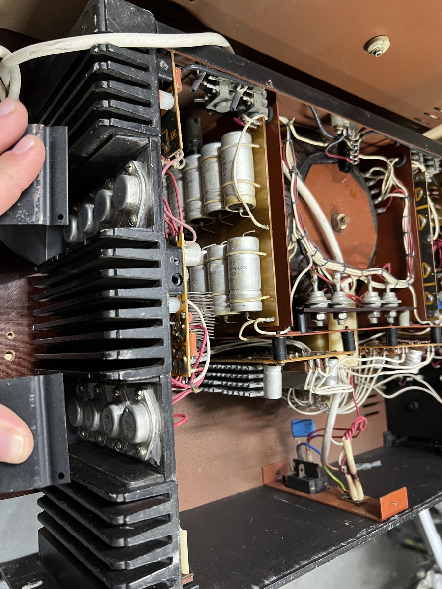 Oldalanként 8-8 db TO-3 végfok tranzisztor dolgozok. Tekintélyes toroid van benne lágyindítással, +-62VDC-ről mennek a végfokok. Robusztus hűtőbordák, rengeteg puffer kondenzátor.