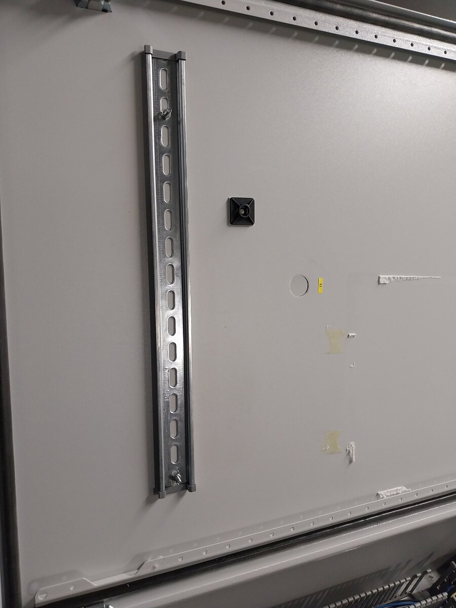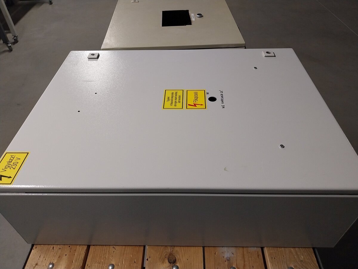 Szerelőlappal, kábelcsatornákkal, kalapsínekkel, sorkapocsblokkal. Csak néhány kábelcsatornához van fedél.