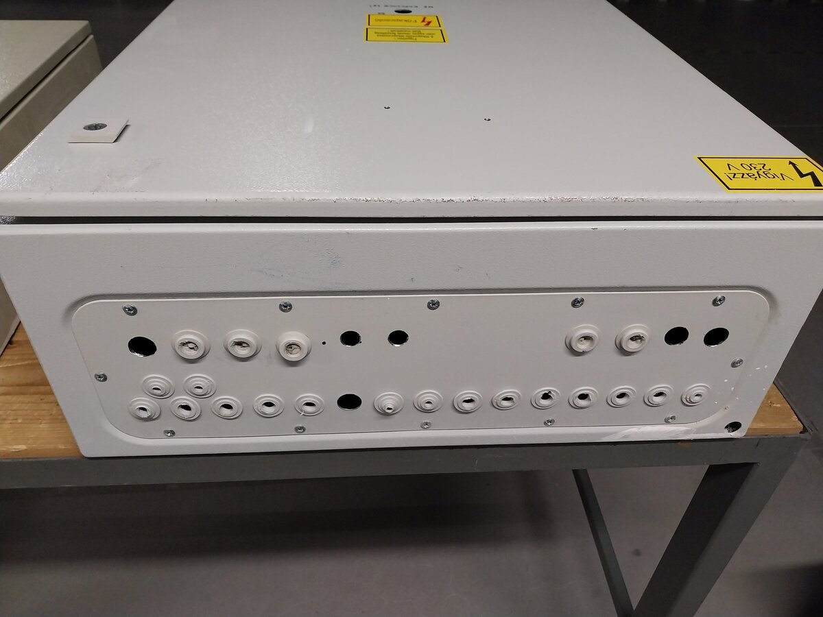 Felső kábelbevezetés fémlapon, oldalain és az alján nincs megfúrva. Az ajtón van egy kapcsolónak kifúrva, valamint rá van csavarozva belülről egy kalapsín két csavarral és két 4mm-es furat van még rajta.
