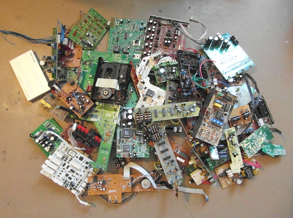 A képen látható az összemennyiség fele, kb. 5-6 kilónyi van. NEM hulladék, nagyon sok használható és esetenként kurrens alkatrész kitermelhető belőlük. MOS-Fet-ek, IC-k tranyók, relék, potméterek, stb. Csak már unom tárolni őket.