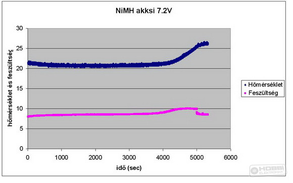 Ez egy 1800mAh-s NiCd akkumulátor töltési diagrammja, 900mA-el töltve. Elég jól látható a feszültségesés.