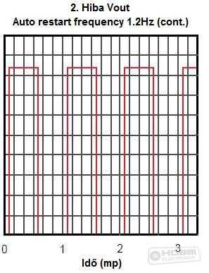 Túl sok hibalehetőség nincs, mivel szerencsére elég egyszerű kapcsolásról van szó, de most mégis leírok pár lehetséges hibát, azok okát és javításának egy lehetséges módját. A tápegység egyáltalán nem csinál semmit. - Ekkor ellenőrizzük, hogy eljut-e az IC-ig a tápfeszültség, ha igen és ennek ellenére sem működik a tápegység, akkor vagy rosszul kötöttük be és meghalt, vagy eleve halott volt az IC-nk. Ha nem jut el a tápfeszültség, akkor ellenőrizzük a biztosítékot, diódahidat. Lehetséges ok még a trafó hibája vagy rossz bekötése, ezt is ellenőrizzük. Bekapcsoláskor nem csinál semmit, de ha kikapcsolom, akkor furcsa hangokat ad a trafó. (1. Hiba > kép) - Ennek szerencsére csak egy lehetséges oka van, ez pedig a D1-D2 diódapáros. Ellenőrizzük, hogy megfelelően ültettük-e be őket, nem hibásak vagy esetleg nem megfelelő típust építettünk-e be. (A pufferben maradt kevéske töltés miatt az IC alacsonyabb frekin ugyan, de próbálna működni, aminek a hangját halljuk is, ahogy próbálkozik az elindulással, ez a hang ábrázolva kb. a következőképp néz ki.) Bekapcsoláskor a szekunderre tett izzó villog. (2. Hiba > kép) - Ennek is csak egy oka lehet, ez pedig a visszajelzés hibája-hiánya az IC számára. Vegyük ki a helyéről az opto-t és kössük össze az IC kontrol lába és az optó tekercsén lévő D7 dióda utáni pontot egy ellenállással. Ennek az ellenállásnak az értékét ki kell számolnunk. Ez nem nehéz: