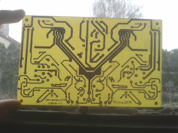 A vasalásos módszerrel elkészített nyák. Sikerült már szebben is, de célnak megfelel. Kimaratás után jöttem rá, hogy az UL kivezetés feliratait le kell kaparnom, mert átütés veszély áll fenn két helyen.