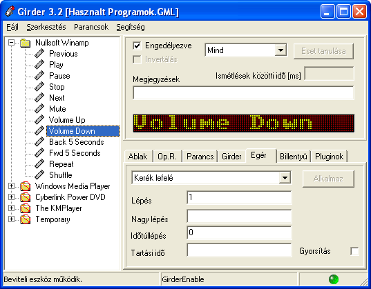 Betanítás Kezdjük tehát el betanítani a Girder programot! Ezt célszerű úgy végezni, hogy elkészítjük a program-könyvtárakat és az eseményleírókat (a könnyebb csoportosítás végett, hogy mely parancsok mihez tartoznak), ahogyan ezt az alábbi képen látjuk, majd elmentjük egy GML kiterjesztésű fájlba. Lehetõségünk van automatizálni a program indulását a Windows indulásakor, a fájl betöltést a programba és a vevõ automatikus engedélyezését. Ezeket a beállításokat a Fájl/Beállítások menüpontban végezhetjük el. Említésre méltó még, hogy az Angol-Magyar nyelvválasztást is a Beállítások menüben végezhetjük, mivel elsõ indításnál a program automatikusan Angol felülettel indul. Tanítani úgy kell, hogy rákattintunk például az elõzõleg létrehozott Volume Down parancsra (amelynek megadtuk, hogy az egér (scroll) kereke lefelé gördüljön egy egységnyit) majd megnyomjuk az Eset tanulása gombot és ekkor a Girder program várja a parancsot, vagyis hogy nyomjuk le a kívánt gombot a távirányítón. Ekkor a program automatikusan elkészíti az eseményleírót. Ennyibõl áll a betanítás. Lehet, feltűnt, hogy a többi mappán egy pirossal áthúzott jelzés van. Ezt az Engedélyezve pipával tudjuk engedélyezni és letiltani, mivel lehet, hogy a KMPlayer parancsai nem egyeznek a Winamp parancsokkal és ne keveredjenek össze a jelek, mikor ugyanazt a parancsot vagy ugyanazt a gombot nyomjuk meg egy-egy eseményre hivatkozva. A cikk még nem ért véget, lapozz! Értékeléshez bejelentkezés szükséges! |