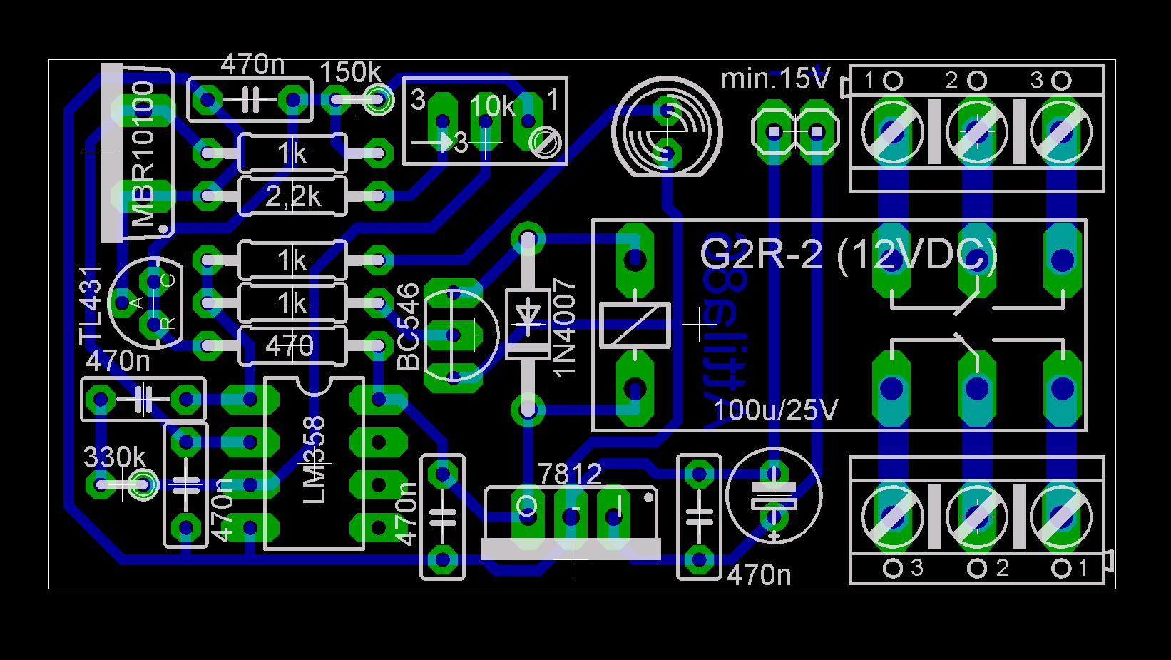 Az áramkör megépítése: A nyáktervet készítsük el, ha vasalásos technikát választjuk akkor arról ITT bővebben olvashatunk. A nyákterv mérethelyes kinyomtatásában segít EZ a kis leírás. A nyákot ez után fúrjuk ki, ügyelve arra hogy a sorkapcsoknak, a relének, a D1, D2-nek és az IC2-nek nagyobb furatra van szüksége. Ha a furatokkal megvagyunk, akkor ültessük be az alkatrészeket, méret szerinti sorrendben az ellenállásokkal és D2-vel kezdve. Utána következnek a kondenzátorok, a TL431, az LM358 és a BC546. Végül ültessük be a "TAP" csatlakozót, a két sorkapcsot, a helitrimmert, a 7812-t, a ledet, az MBR10100-at és legvégül a relét. A nyák elkészítéséhez szükséges képek (nagyobb felbontásért katt a képekre!): Az áramkör élesztése: Az áramkört egyenlőre ne szereljük fel a hűtőbordára. A tápfeszültséget ez előtt kapcsoljuk az áramkörre. A tápfeszültség ráadása után a lednek nem szabad világítania és a relének elengedve kell maradnia. (A helitrimmer osztásarányát úgy állítottam be, hogy kb. 42 és 85 fok közti kapcsolási hőmérsékletet lehessen beállítani. Feltételezem, hogy ekkora hőmérséklet nincs a helyiségben az élesztés során.) Az áramkör különösebb élesztési folyamatot nem igényel, de ha netán mégsem működne, akkor a következőket ellenőrizzük: A helitrimmert eltekergetve ellenőrizzük, hogy az LM358 3-as lábán a feszültség változik. Ez után tekerjük el abba a végállásába, ahol a 3-as lábon a legnagyobb feszültséget mérjük. Ez után mérjük meg, hogy mekkora feszültség van az LM358 2-es lábán! Majd a D1 diódát kezdjük el melegíteni például úgy, hogy hozzáérünk a forrasztópáka hegyével. Közben figyeljük, hogy a 2-es lábon a feszültség csökken-e. Ha csökken, akkor a melegítés hatására kis idő múlva a lednek ki kell gyulladnia és a relének meg kell húznia. Ez után hagyjuk hűlni az MBR10100-at és figyeljük meg hogy a LED elalszik-e és a relé elenged-e. Ha megbizonyosodtunk az áramkör helyes működéséről, akkor szereljük azt a figyelendő felületre. A D1 diódát a nyáklap szélére terveztem így nem szükséges azt a paneltól elvezetni, de ha a konstrukció úgy kívánja akkor bátran elvezethetjük. Igyekezzünk, hogy (termikusan!) a lehető legközelebb szereljük a D1 diódát a melegedő alkatrészhez (végtranzisztor, teljesítmény-erősítő IC...). D1 dióda és a hűtőborda közé tegyünk csillám szigetelőt és hővezető pasztát. Ha úgy tartja kedvünk, akkor a hővédelem ledjét kivezethetjük a készülékünk előlapjára is, hogy lássuk ha leold/bekapcsol a hővédelem. Végezetül pár kép és videó az áramkörről: Sikeres utánépítést kívánok! Üdv.: Attila Értékeléshez bejelentkezés szükséges! |