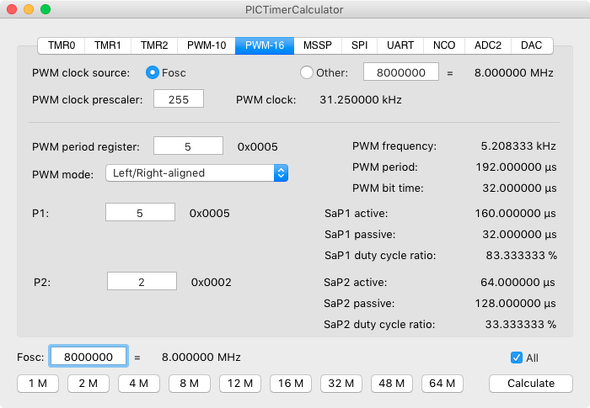 Figyelem! A viszonylag új kontrollerek esetén (pl. PIC18F27Q43) az adatlap 16 bites (két db. 8 bites) periódus regisztert említ, ám a modul csak 10 bitet használ (jobbra vagy balra rendezett módon). 10 bites PWM modul helyes működéséhez a hozzá rendelt Timer2, 4, 6 stb. órajele kötelezően Fosc/4.