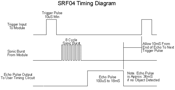 Az SFR04-es szenzor közvetlenül nem a tárgyak távolságát méri. A tápellátásért felelős VCC és GND lábak mellett rendelkezik egy un. Trigger és egy Echo lábbal is. Amikor a Trigger lábat legalább 10us-ig magas állapotra kapcsolják, akkor a szenzor egy 8 impulzusból álló ultrahang hullámcsomagot bocsát ki. Ekkor az Echo láb magas logikai állapotra vált, és mindaddig magas állapotban is marad amig a céltárgyról visszavert hang visza nem érkezik a detektorba. Az Echo lábon megjelenő jel hossza lényegében azt az időintervallumot mutatja ami alatt az ultrahang impulzus elér a céltárgyig és onnan vissza.