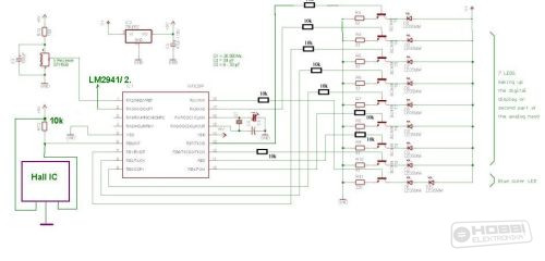 A mechanikát később az eredeti Soubry Henk-féle propeller óra programjával is vezérelte, csak az alsó (fali) vagy csak a felső (asztali) félkör kijelzését engedélyezve. Az infra távvezérlés így belekerült a rendszerbe, de a vezérléshez két 16F628 vagy 16F628A kellett: a rotoré a LED-ek vezérlésére, a bázisé a kar indítására, leállítására. Később a rotor programját módosítottam, kiegészítettem az LM2941 vezérlésével, így már egy kontroller is elég lett. Ebben a verzióban minden információ az egyik félkörben jelenik meg. Eleinte optokapuval, aztán már Hall érzékelővel oldotta meg a szinkronizálást.