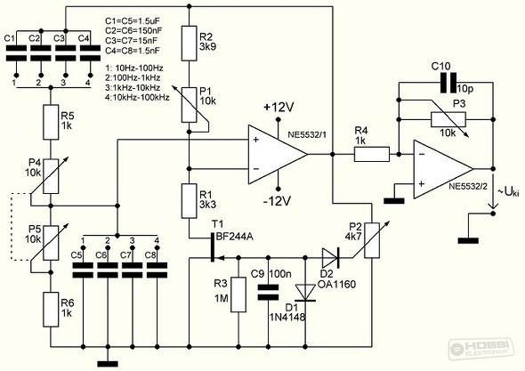 Akkor van egy kész műszerünk? Majdnem. Jó lenne, ha az eszközük frekvenciáját széles sávban tudnánk változtatni, amplitúdóját nagy stabilitás mellett szabályozni. A Wien-hidas oszcillátor – az egyszerű hangolhatóságának köszönhetően – a legszélesebb körben alkalmazott RC-oszcillátor. Utalva a kezdetekben tárgyaltakra, ismeretes a Wien-osztó saját frekvenciájának általánosan alkalmazható képlete: