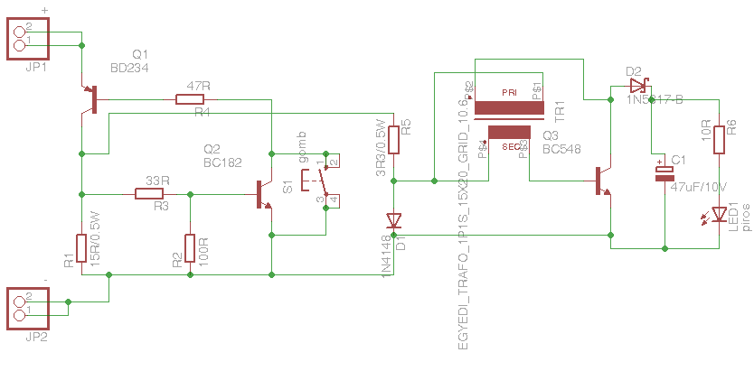 Régóta terveztem Proli007 cikkében közölt akkumerítő megépítését. Egyetlen gondom volt vele, hogy abban az indikátor egy izzó, az izzóknak pedig van egy rossz szokásuk: előbb-utóbb kiégnek. Ezért más megoldást kerestem, és végül találtam egy jópofa egy-tranzisztoros DC step-up kapcsolást. Ezzel egy LED-et akár 0.5V-ról is meg lehet hajtani, így az izzót már ki tudtam váltani.