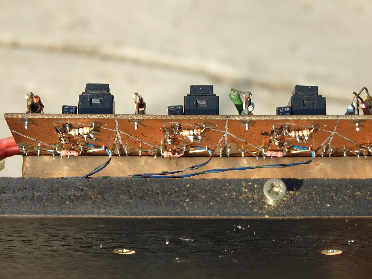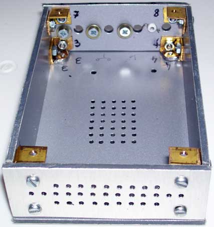 Végre elkészültem az akkumerítő bedobozolásával. Kicsit tovább tartott mint reméltem, mert nem igazán terveztem meg, hogy miként fogom bedobozolni, és még azon is folyamatosan változtattam... Beépítettem Freddi által javasolt kondenzátorokat. A doboz fala 3 mm vastag műanyag lemez, vékony alumínium bevonattal. A sarkokba az összefogó elemeket L profilú 1 mm vastag réz díszlécből készítettem. A gombokat a bútorok csavarjainak elrejtéséhez használt műanyag tiplikből alakítottam ki. Az áramkört az alsó laphoz rögzítettem hosszú csavarokkal rézcsőből készült távtartókon keresztül. A Ledek kicsit távolra kerültek a "betekintő" nyílástól, de a nyákhoz képest szűk dobozméret miatt nem lóghat ki semmi a nyákról, különben elakad a réz sarokelemekben szét és összeszerelésnél. Fúrtam az aljára és a hátsó falára pár lyukat, hogy az eldisszipált hő könnyebben távozhasson.