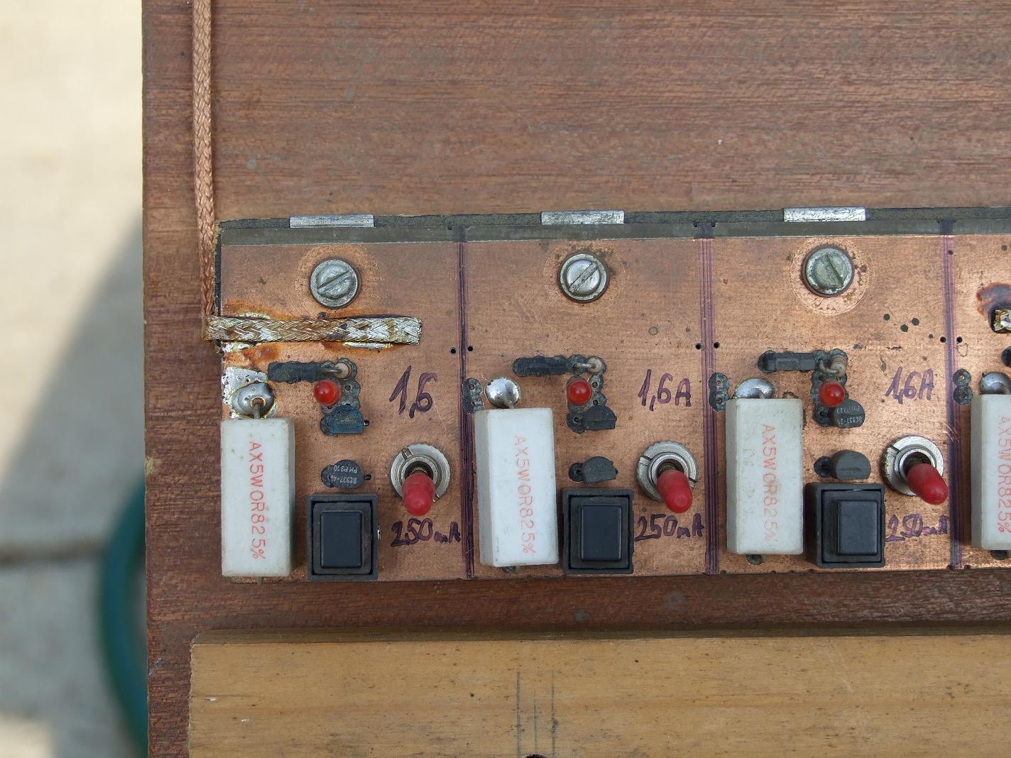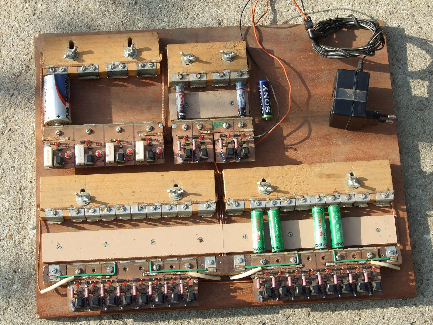 Na leporoltam a szakállas kisütőmet, és befotóztam. A kapcsoló tranzisztor (nagyáramu) 2SA1431. Na ezt soká kutattam anno a paraméterek miatt, bár más PNP-vel is üzemképes. A másik tranyoja BC237C. Ebből kettő van, az egyik csak a led meghajtását végzi, így segédtáppal követhető, hogy mikor végez. Található minden egyes egységen külön egy kapcsoló (kék, rugós, bontásból van, 1A-os, nincs kontakt hiba. Kapható is úgy tudom.), amellyel kb. 350 és 50mA között váltható a kisütő áram nagysága. Ezt azért találtam ki, hogy a már normál terhelésre leeső kapocsfeszülségü akkuk úgynevezett "maradék kapacitását" (én így neveztem el) ki tudjam sütni. Így garantáltan eltávolítható a cellából szinte az összes töltés, az is, amely már a terhelést nem viseli el, és így nagyobb áramon a kisütő már lekapcsolna (memória effektusos cellák). 4db nagyobb áramú kisütő is van a combosabb celláknak, mint pld. mono (goliat). Ezek szintén két áramot tudnak, de itt a nagyobb 1,6A, a kisebb 250mA. Minden rekesz állítható méretű, a AAA (micro) méret a legkisebb. A felső méret 16db-nál AA, míg a négy nagynál mono (goliat). Kb. 10 éves a szerkezet, és látott már rengeteg cellát. Ez még jóval a HE létezése előtt készült. A kapcsolás alapja szintén az, amit már proli007 is közzétett, egy pnp-npn tranzisztor pár, amely egy kapcsolóval öntartó áramkört alkot, aminek lekapcsolási pontját az ellenállások méretezésével határozhatjuk meg. Az eredeti ötlet egy valaha volt NDK-s elektronikus memória akku védő áramköre szolgáltatta. Az 3 soros cellára volt méretezve.