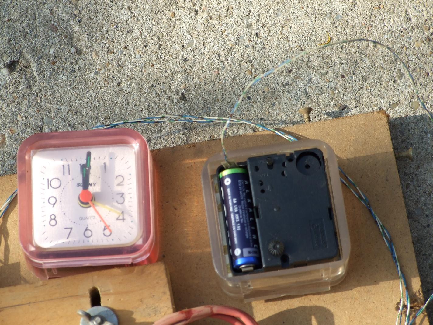 Most jön a cellamérő "félautomata". Ez is a kisütőkkel egy időben készült, hogy valahogy mérni lehessen a cellák kapacitását. Az áramköri megoldása ugyan az, mint a kisütőké, de itt nincs kapcsoló, egy fajta kisütőáram van. A kisütőáram állítására a két tüskére forrasztott ellenállások szolgálnak. Ebben a kapcsolásban külön kijelzés nincs, azt a hozzá kapcsolt óra látja el. Amíg ketyeg, tart a kisütés, a másodperc mutatóról ez azonnal látható (addig ugye megy). A kisütés előtt 12:00 állítva az órát, a végén leolvashatjuk, mennyi idő kellett a kisütéshez. Ha ehhez tudjuk a kisütő áramot is, kiszámolható a cella kapacitása. A kisütőáram nem azonos a kisülés alatt, ezért közelítést használok. A töltőáramot 1,24V cellafeszültségre állítom be, pld. 2000mAh aksinál 200mA kisütőáramot 1,24V feszültségnél (ekkora feszültségnél ekkora árammal terheli a mérő-kisütő a cellát). A sima kisütőben egy BC237C kapcsolja a ledet, amely jelzi a kisütő működését. Ebben a kapcsolásban az óra elemét kapcsolja, így az óra csak addig üzemel, amíg a kisütőáram megy. Ezzel mérjük a kisütés idejét Az elem a + érintkezőnél van megszakítva az óránál. Egy három rétegű "szendvics" van az elemtartó és a + pólus között: rézlemez - műanyag lemez - rézlemez. A rézlemezek pillanat ragasztóval vannak a műanyag lemezre ragasztva. Ehhez vannak forrasztva a vezetékek, és így az elem és az érintkező közé téve vezérelhetővé válik az óra.