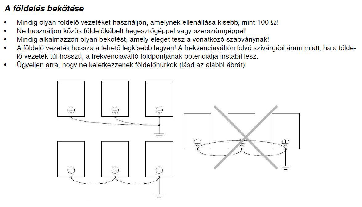 Védőföld lehet felfűzött, vagy csillagpontos, ne legyen hurkolt. Jel és vezérlő kábelek árnyékoltak és azok is egy ponton bekötve a többihez.