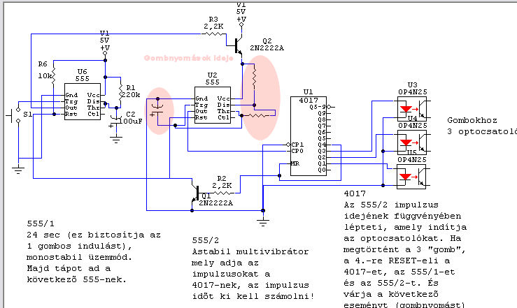 2 db 555 időzítő (556 nem célszerű mivle közös tápja van) 1 db 4017 dekád számláló A többi pedig a képen fel van tüntetve. A második 555-nél bekarikáztam azokat az alkatrészeket amit neked kell beállítani, egy 555 kalkulátor segít. Ez lesz a gombnyomások közti időtartam. (amennyiben belefér 24 másodpercbe hogy le ne előzze a tápot biztosító első 555-öt)A 4017 dekád számláló meg kapcsolja az optocsatikat. Szerintem más hozzáfűzni való nincsen, a kép is kommentelve van. Sok sikert hozzá! üdv: Zsuscsinyo |