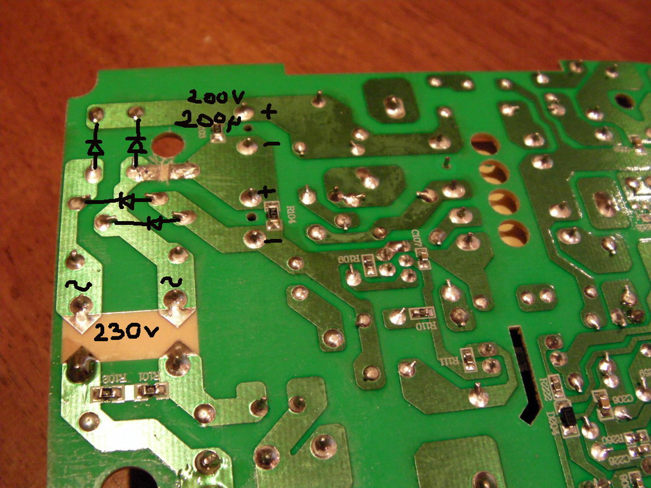 Hasonló az enyém is de jó lenne látni alulról az alkatrészek bekötését kondi +/- diódák iránya. Ha esetleg rá tudnád írni. Vagy az enyémen ha látod a megoldást akkor az is jó. Bár én azt látom hogy a tiéden a kondik közös pontja van leválasztva a trafóról. Tényleg jó lenne látni a diódák irányát. Valamint a trafó utáni kondi értéke kellene, mert a helye ott van az enyémen is.