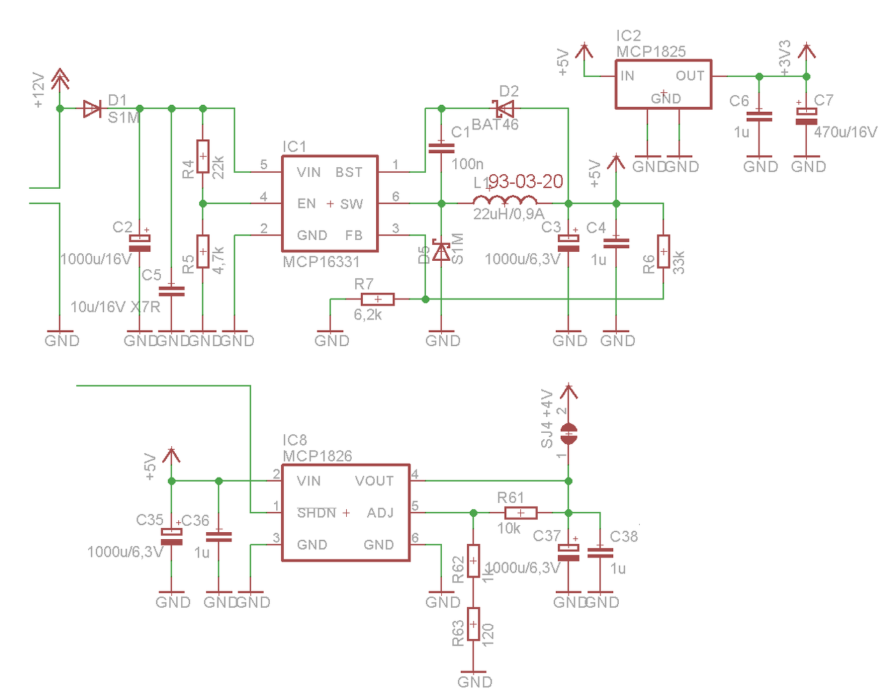Van egy panelom amin egy MCP16331 dolgozik, a feladata 12V-ból 5V előállítása. A kapcsolás két példányban (két ugyan olyan panelon) van megépítve, teljesen ugyan azok az alkatrészek vannak mindkettőn beültetve. Az egyiken viszont működik a konverter, a másikon nem. Utóbbin annyi történik hogy a betáp rákapcsolásakor megjelenik kb 200-300mV a konverter kimenetén majd ez elkezd szép lassan emelkedni és kb fél-egy perc múlva megáll kb 1,9-2V körül és úgy marad. Kicseréltem már a hibás panelon az összes alkatrészét a step-downnak, végül már az induktivitást is de semmi sem változott. Van valakinek ötlete? ![]() Ja igen, kínomban kicseréltem az MCP16331-et MP2459-re amely azonos tokozású és lábkiosztású, gyakorlatilag szinte teljesen ugyan az a két konverter. Na az MP2459-el elindult a táp rendesen! Tehát még arra sem lehet gyanakodni hogy esetleg a panel lenne szakadt vagy zárlatos. Az pedig sajnos nem működhet hogy jó akkor benne hagyom az MP2459-et mert az viszont kisebb áramot tud csak és ide az nem elég, sajnos muszáj az MCP16331. A 3,3V-os ág áramfelvétele kb 100mA, a 4V-osé durván ugyan ennyi de csúcsban Amperos nagyságrendű is lehet (azért van ott a C35 és a C37 1000µF-1000uF), az 5V-os tápágon pedig nincs más fogyasztó. A hozzászólás módosítva: Máj 8, 2017