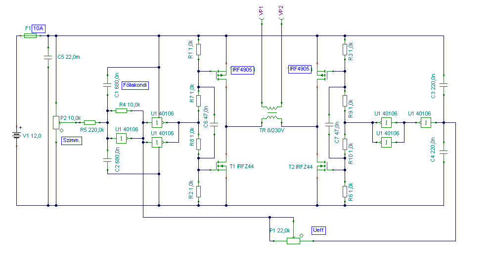 C1 hibásan van jelölve, nem elkó kell ide, hanem bipoláris kondi! pMOS-nak IRF4905-öt javaslok, nMOS-nak IRFZ48-at. (Ezeket szigetelve kell rögzíteni!) Mondjuk nem lenne sokkal bonyolultabb kvázi-szinuszosra átalakítva sem.