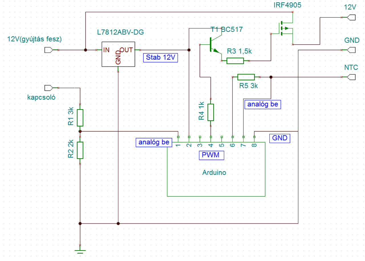 A MOSFET bekötése így nem lesz jó. A source lábát 0V-ra kell kötni a fűtőszálat pedig a drain és a +12V közé. (open drain output)