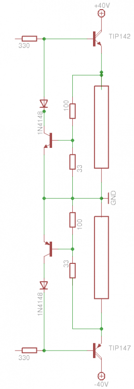 http://bsselektronika.hu/index.php?id=212 Ebből először a teljesítmény erősítőt, (a csatolt file) Először tesztnek, csak számítógép tápról, 12V-ról, hangszótó nélkül (mint a csatolt kapcsoláson) A bázist egy feszültség osztóval hajtottam meg. Csodálatosan működött, a kollektoráramot maximálta ~3,5A körül.. Ezután rákapcsoltam, egy +-40V-os tápra aminek kb 3Aa max árama. (Ez egy kapcsoló üzemű, rövidzár esetén nem áll le, hanem teper...). Ekkor (növelve a bázis áramot az osztóval) 3A körül (mint várható) esett a tápfesz de nem pár voltot hanem felére, mert a Tip142 (vagy 147) kollektor-emittere zárlatos lett (oda vissza) Miért van ez?