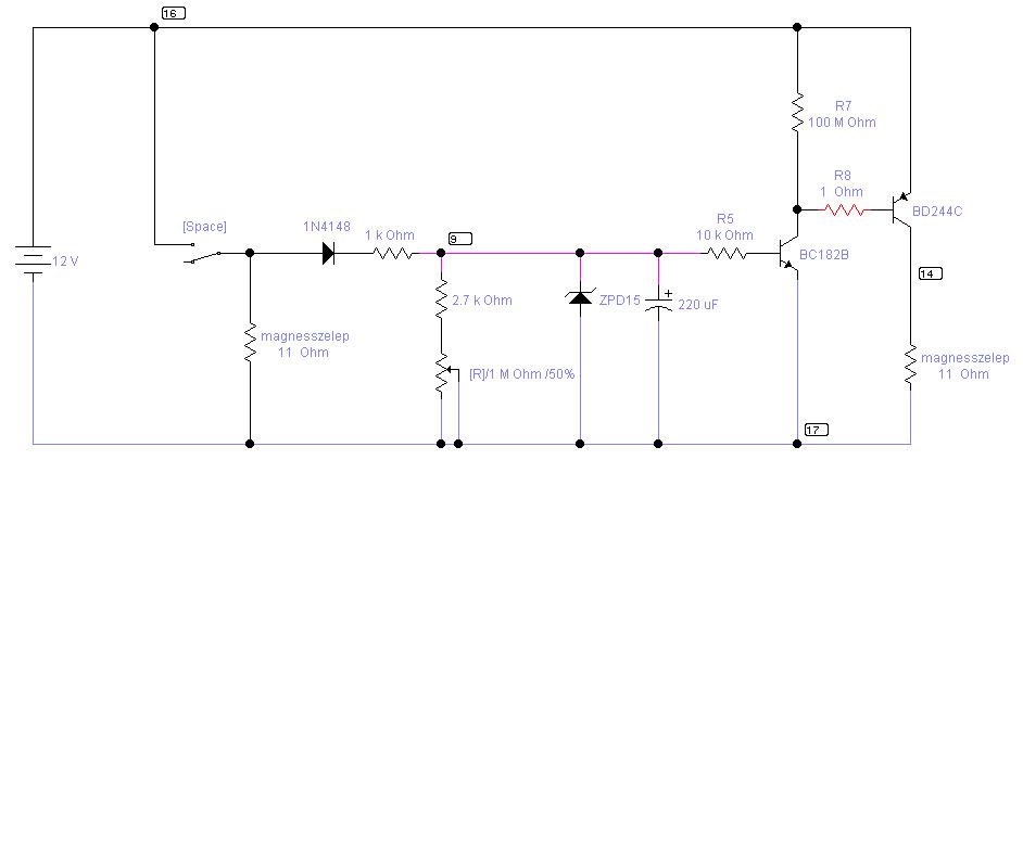 Van két 12 V-os mágnesszelepem, amiket egy kapcsolóról működtetek, de az egyik kikapcsolását 1 perccel késlelteteni akarom. Mekkora legyen R5, R7, R8 értéke, hogy az áramkör működjön? A mágnesszelepek ohmikus ellenállását vettem csak figyelembe, induktivitását elhanyagoltam. RC tagként a 2,7k-s ellenás + 1M-s trimmer és a 220µF kondi szolgál. Az ármakör megépítve jelenleg nem működik.