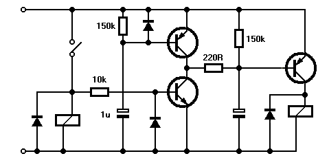 Ezzel a kapcsolással épeszű méretű kondival nem lehet egy percet késleltetni! A PNP taranyó bázisába helyezett kondi azt az előnyt kínálja, hogy csaknem tápfeszig kell töltődnie ahhoz, hogy a BD lezárjon. Biztos működést eredményez, azonban egy kis hűtés kell a lassú lezárás miatt. Ha kisebb kondival akarod megoldani, akkor darlington kell a BD helyére, akkor 1Megáig növelhető a töltő ellenállás (ami egyben a kapcsolótranyó lezáróellenállása is)